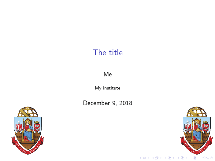 \documentclass aspectratio=169 {beamer} \usepackage english {babel} % 加导航.. Add title slide details (authors, affiliation and a date if … 02.12.2013 · place logo properly in beamer date mon 02 december 2013 category latex tags logo / beamer / pgf. 03.06.2021 · which yields the following title page: This quick post shows an easy way how to do this using latex. 19.09.2019 · i want to add two companies logos on the top right side on the slide (in frame titles on each frame). How do i do that. I use berkeley beamer theme which i would like to keep, if possible... 6.3 add logo to title page.