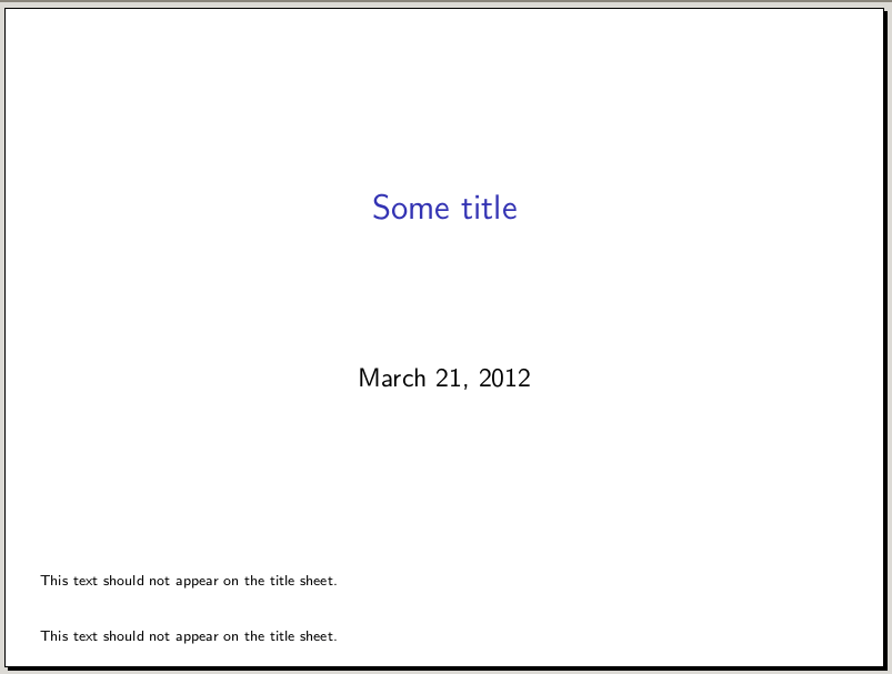 27.01.2011 · adding your company's logo or brand to the title page of an product description, general terms and conditions or news announcement makes it look more professional... Also, to hide logo and also page number on title page, you'll need to this. Use \logo{} command if we would like to add the logo to all slides or \titlegraphic{} command to display it only on the title page. Add title slide details (authors, affiliation and a date if … How do i do that. Create a box for the title and subtitle of the presentation. While i know that i can add a logo to every slide by \logo{\includegraphicswidth=.2\textwidth{logo.png}}, i want to add a logo only to the top right of the title slide like the presentations in. To position our logo at any place of the title page (or slides in general), we will use tikz package. We can use the titling latex package to alter our title block to include an image. 02.12.2013 · place logo properly in beamer date mon 02 december 2013 category latex tags logo / beamer / pgf. 6.3 add logo to title page. Also, to hide logo and also page number on title page, you'll need to this.